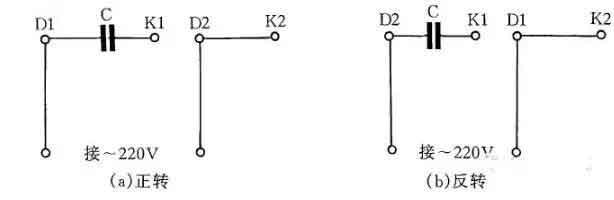 圖4是JX07A-4型單相電容運轉電動機接線方法。電動機功率為60W,用220V/50Hz交流電源、電流為0.5A。它的轉速為每分鐘1400轉。電容選用耐壓400~500V、容量8μF的產品。圖4(a)為正轉接線,圖4(b)為反轉接線。