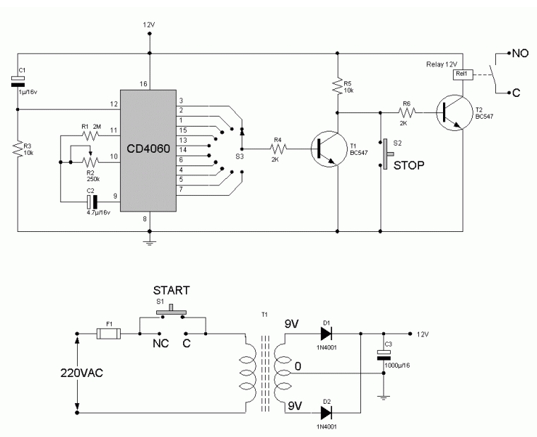 這是CMOS CD4060的電子計時器,它是CMOS 14級紋波傳送二進(jìn)制計數(shù)器/分頻器和振蕩器。