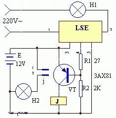 用LSE設(shè)計(jì)的電路簡(jiǎn)單,實(shí)現(xiàn)全自動(dòng)化。當(dāng)有220V交流電時(shí),照明燈H1點(diǎn)亮,