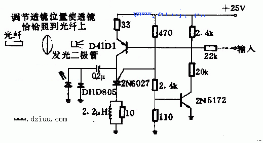 本電路使用中心頻率為50kHz的脈沖速率調制系統。饋給發射機的音頻改變著脈沖速率,用以驅動耦合到光纖的發光二極管(LED)。LED采用通用電氣公司的LED55C或類似的LED。位于光纖另一端的光敏晶體管接收并且解調光信號,使音頻信號復原。 本文由m.flswjt.cn整理提供,部分內容來源于網絡,如有侵犯到你的權利請與我們聯系更正。
