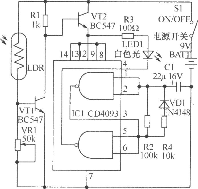 減少能量消耗。發光二極管采用閃光照明。IC1選擇CMOS集成電路CD4093。VT1、VT2選擇BC547三極管。LED1選擇Φ8mm白色發光二極管,其他元器件如圖