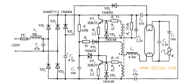 燈一旦被點亮,LC串聯電路則失諧,燈管兩端電壓將為100V左右,L2只起限流作用,C8則起隔直作用,C9通過的極小電流對燈絲起輔助加熱作用。