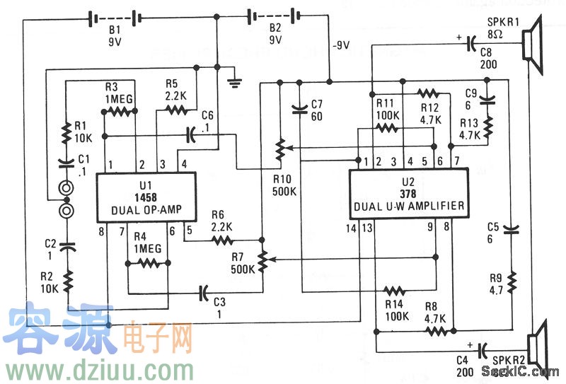 該電路圍繞2個芯片設(shè)置,一個是MC1458雙運放構(gòu)成前置放大器,另一個為LM378雙4-watt放大器。前置放大器的增益由R3/R1獲得用于一側(cè),另一側(cè)為R4/R2,大約為100。通過比率增加,增益隨之變化。 :