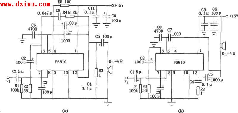 如圖 為FS810集成功率放大器的實用電路。FS810是性能優(yōu)良的集成功率放大器,適用于高檔收錄機和音響設(shè)備。本文由m.flswjt.cn整理提供,部分內(nèi)容來源于網(wǎng)絡(luò),如有侵犯到你的權(quán)利請與我們聯(lián)系更正。