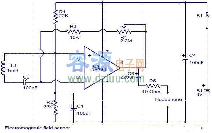 簡單電磁場傳感器電路    <<版權聲明:本文由容源電子網(www_dziuu_com)整理提供,部分內容來源于網絡,如有侵犯到你的權利請與我們聯系更正。》