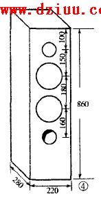 :(1)后箱板上要開二個孔,用于安裝面板和散熱器,開孔尺寸比面板和散熱器每邊各縮小1cm,便于固定螺絲。(2)箱內放置4根支撐木方,用于放置變壓器。變壓器放置在與揚聲器保持 距離并且靠近倒相孔的部位。