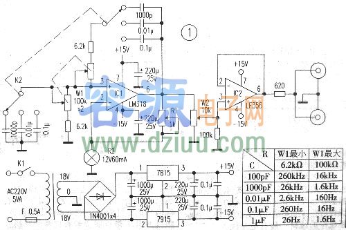 用作振蕩器的運放,其振蕩頻率最好在運放頻率參數的十分之一較為可靠。這里采用頻帶寬度達15MHz的單運放LM318,有條件的話 八腳金封的,不過筆者采用的是雙列直插(DIP)塑封的集成塊。   <<版權聲明:本文由容源電子網(www_dziuu_com)整理提供,部分內容來源于網絡,如有侵犯到你的權利請與我們聯系更正。》
