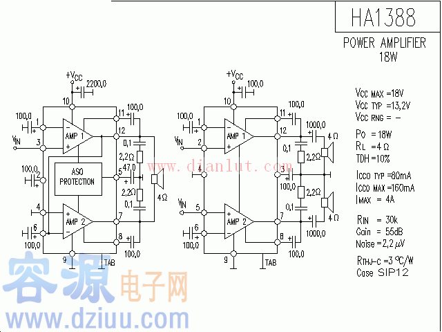 HA1388是音頻功率放大集成電路,應用電路,采用12腳單列直插塑料封裝結構。具有很多優點,該電路在電源電壓13.2V、 4負載阻抗和10%失真時,輸出功率為l8W。  :