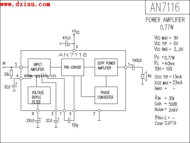 制作,電路參數都標在AN7116功放電路圖中,請你參考,工作電壓最大是9V,最大工作電流是23MA,AN7116功放集成塊外圍元器件只有7 個器件,希望本電路能對功放DIY的朋友有 的幫助。下面提供AN7116功放電路圖。本文由m.flswjt.cn整理提供,部分內容來源于網絡,如有侵犯到你的權利請與我們聯系更正。