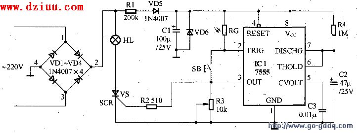 VS是晶閘管,控制燈的亮、滅。其工作原理是:白天當光線照射到光敏電阻RG時,其阻值變得很小,按動按鈕SB,7555的2端不能產生幅度低于VCC/3的觸發(fā)負脈沖,故不能使7555的3端輸出高電平來觸發(fā)VS使它導通,電燈HL不亮。晚上:RG阻值變大,當按按鈕SB時,7555的2端產生了低于VCC/3的低電平脈沖,從而使7555定時器的3‘端輸出約50s( 間可調)的高電平,它觸發(fā)VS的控制端,使VS導通,電燈亮。50s過后,7555定時器的3端恢復到低電平“O”,晶閘管截止,燈滅。實現了只有夜間按動按鈕SB才能使燈亮,而白天按也不亮的智能