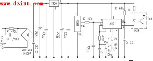 電路見(jiàn)附圖。溫度傳感器LM35將其接收到的溫度信號(hào)轉(zhuǎn)換成電壓信號(hào)輸出。然后通過(guò)一個(gè)LM131,將其接收到的從LM35輸出的電壓信號(hào)轉(zhuǎn)換成頻率信號(hào)后輸出,其輸出頻率可通過(guò)下面的公式進(jìn)行計(jì)算: 《版權(quán)聲明:本文由m.flswjt.cn整理提供,部分內(nèi)容來(lái)源于網(wǎng)絡(luò),如有侵犯到你的權(quán)利請(qǐng)與我們聯(lián)系更正!