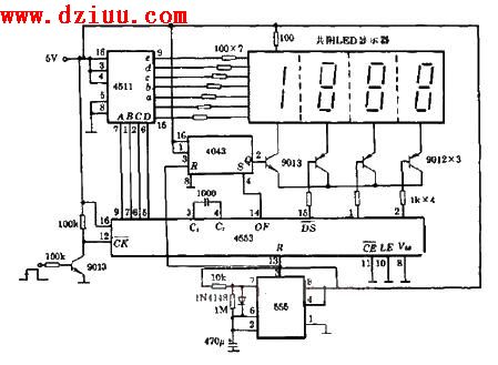 圖中,555用于定時復零,4553是十進三位CMOS計數器,4511是BCD碼七段譯碼器。《版權聲明:本文由m.flswjt.cn整理提供,部分內容來源于網絡,如有侵犯到你的權利請與我們聯系更正。》