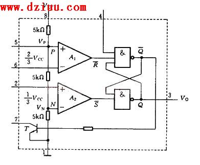 (1)分壓器 由三個5kΩ的電阻串聯組成分壓器,其上端接電源VCC(8端),下端接地(1端),為兩個比較器A1、A2提供基準電平。使比較器A1的“+”端接基準電平2VCC/3(5端),比較器A2的“-”端接VCC/3。 在控制端(5端)外加控制電壓。可以改變兩個比較器的基準電平。不用外加控制電壓時,