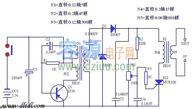 晶體管BG組成一個振蕩器,將1.5V直流電經T 1升壓、D整流、C3儲能后供可控硅自動放電回路。接通開關S后,C3兩端的電壓不斷的升高,當電壓升高至某一設定值時( 在400V左右,由R3調定)。《版權聲明:本文由m.flswjt.cn整理提供,部分內容來源于網絡,如有侵犯到你的權利請與我們聯系更正。》