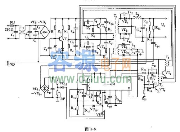 TL494構成半橋式脈沖調寬開關電源原理圖《版權聲明:本文由容源電子網(www_dziuu_com)整理提供,部分內容來源于網絡,如有侵犯到你的權利請與我們聯系更正!