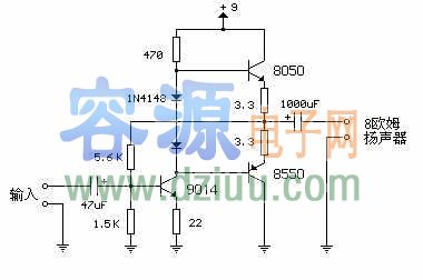 3.3歐姆電阻串聯在輸出三極管的發射極上,以穩定偏流。以減小環境溫度、不同器件(如二極管、輸出三極管)參數區別對電路的影響。當偏流 時,輸出三極管發射極與基極間電壓會減小,以減小偏流。此電路輸入阻抗為500歐姆,在使用8歐姆揚聲器時,電壓增益為5。
