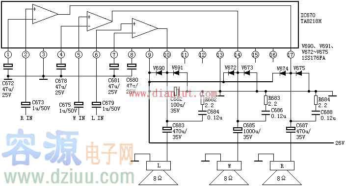 TA8218AH引腳功能及伴音功放電路圖:TA8218AH主要應用于彩色電視機伴音功放電路中,此集成電路支持三聲道音頻信號,采用26V供電,外圍元器件很少,維修方便。詳細電路及參數如下: