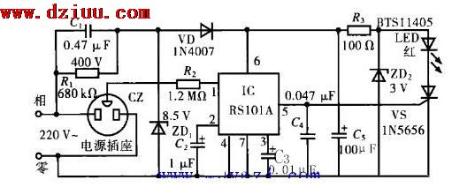 電路工作原理:lC是RS101A型專用漏電保護開關集成電路。LED是BTS11405型頻閃發光二極管,只要接通電源后就町發出閃光。市電經由C1、ZD1、VD組成的電容降壓整流穩壓電路,再由C5濾波后獲得的直流電壓供本電路使用。    <<版權聲明:本站內容部分來源于網絡,如侵犯到你的權利請及時與我們聯系更正,聯系QQ:316520686!