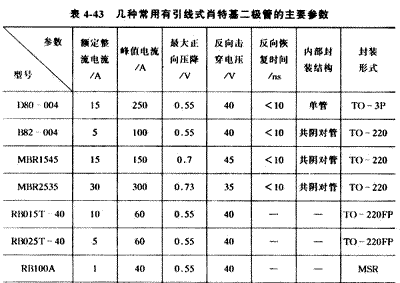 常用的有引線式肖特基二極管有D80-004、B82-004、MBR1545、MBR2535等型號,各管的主要參數見下表。