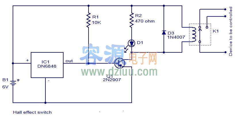 在一個果殼繼電器就會接通時,磁鐵的南極靠近霍爾效應傳感器IC DN6848 。電阻R1將始終拉基地Q1的一個很輕微的正電壓,從而防止意外觸發。繼電器被激活時,發光的LEDD1和電阻R2限制電流通過D1。二極管D2是一個續流二極管和保護的高電壓尖峰引起的,當繼電器切換。的晶體管Q1的電路圖 。