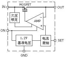AAT4610將6V/2A的P溝道MOSFET場效應管與柵極驅動器、電壓基準、限流比較器和欠壓閉鎖電路組合在SOT-23-5封裝中(如圖2)。其中MOSFET是一個電子開關,它的通斷受比較器輸出電壓的控制,如果輸出電流大于設定電流,運算放大器AMP輸出負電壓,關斷MOSFET,停止電壓輸出,對供電電路起到保護作用。MOSFET的溝道電阻最大值僅為180mΩ,關斷模式下靜態電流為1mA。MOSFET的工作電壓為2.7V~5.5V,輸入電壓低于2.7V時,由欠壓鎖定電路關斷MOSFET,對供電電路進行欠壓保護。