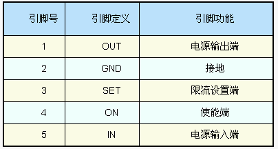 我們仍以AAT4610為例,說明電子開關實現過流保護的工作原理。AAT4610采用SOT-23塑料封裝(如圖1),5個引腳的定義見表1。