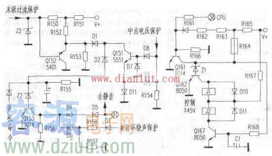 該電路以Q4、Q5為中心,組成了直流電壓取樣檢測電路。圖中的Q1、Q2等系右聲道功率輸出電路(左聲道功率輸出電路圖中未畫出)。右聲道的直流電壓取樣信號經由R6(左聲道取樣信號經由R21)衰減、隔離,C2、C3濾波
