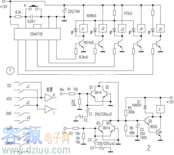 音源輸入電路和喇叭保護電路,其原理簡介如下: CD4017以及其外圍電路組成音源切換電路,開關K是轉換按鈕,每按一下CD4017相應的某個腳將輸出高電平,使與這個腳連接的三極管導通,連接在該三極管的繼電器獲