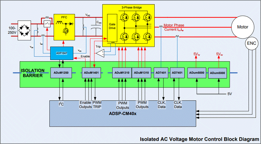 圖1所示為Boston Engineering Corporation開發的高電壓FlexMC電機控制驅動的框圖(),它能與ADSP-CM40x混合信號控制處理器對接。它接收一個通用交流輸入,提供一個功率因數校正(PFC)前端,驅動一個永磁同步電機(PMSM),并為一個帶傳感器或不帶傳感器的控制裝置提供必要的反饋調理,此裝置運行于ARM® Cortex™-M4混合信號控制處理器ADSP-CM40x及一個16位高精度模擬前端。中間部分是一個隔離柵,位于高電壓電源電子元件和控制器之間。電機電源電子元件隨高電壓電勢而浮動,而ADSP-CM40x處理器則以接地為基準,因此需要進行隔離。本文將討論選擇數字隔離器而非光電耦合器將如何改善該設計。