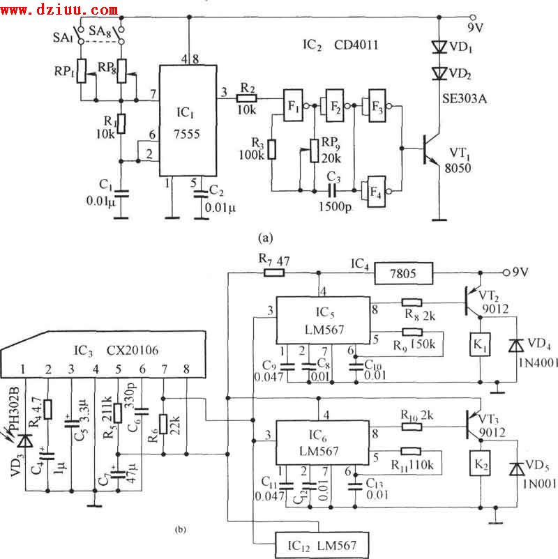 電路中由CX20106、LM567組成。元器件少,方便制作。電路圖如下: