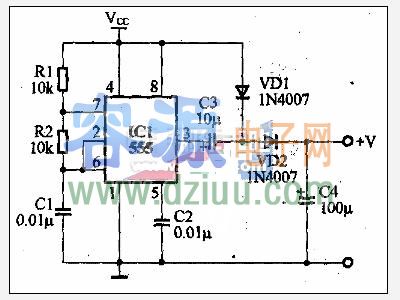 555集成電路和R1,R2、C1組成無(wú)穩(wěn)態(tài)多諧振蕩器,按圖中阻、容參數(shù),振蕩頻率約在5kHz左右,經(jīng)VD1、VD2整流、倍壓輸出。假如輸入電壓VCC=12V,則輸出電壓約在20V~24V,根據(jù)負(fù)載大小而有所變化。 <<版權(quán)聲明:本文由容源電子網(wǎng)(www_dziuu_com)整理提供,部分內(nèi)容來(lái)源于網(wǎng)絡(luò),如有侵犯到你的權(quán)利請(qǐng)與我們聯(lián)系更正。》