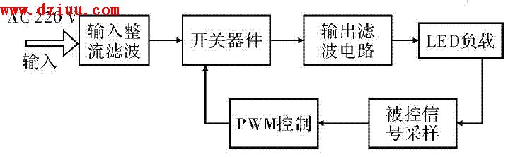 可以做到80% ~90% 。該類電路都有完善的保護(hù)措施,屬高可靠性電源。PWM 開關(guān)電路由4 部分組成,即輸入整流濾波、PWM 控制、開關(guān)器件和輸出濾波。根據(jù)PWM 方式開關(guān)電路設(shè)計(jì)的LED 驅(qū)動(dòng)電路框圖如圖1  。    <<版權(quán)聲明:本文由容源電子網(wǎng)(www_dziuu_com)整理提供,部分內(nèi)容來源于網(wǎng)絡(luò),如有侵犯到你的權(quán)利請與我們聯(lián)系更正。》