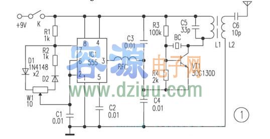 VT1 外圍元件構成晶體穩頻電容三點式振蕩器,諧振頻率27.145MHz。VT1振蕩產生的高頻載波經555③腳輸出的方波信號調制,由天線發射出去。    <<版權聲明:本文由容源電子網(www_dziuu_com)整理提供,部分內容來源于網絡,如有侵犯到你的權利請與我們聯系更正。》