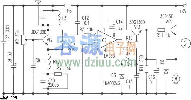 為接收驅動電路,為簡化接收電路,由VT2 外圍元件構成超再生檢波器,檢出原方波調制信號,經C12、R7送至IC2的③腳,放大后的信號經D3、D4倍壓整流,由VT3射隨器輸出其平滑后的直流電壓。該電壓的大小與發送的不同占空比信號波形有關。   <<版權聲明:本文由容源電子網(www_dziuu_com)整理提供,部分內容來源于網絡,如有侵犯到你的權利請與我們聯系更正。》