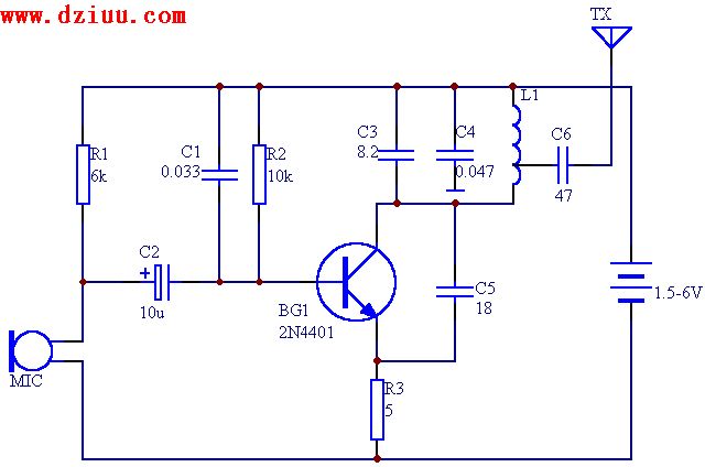 電路介紹:本電路在本人在網上發現的一個簡單微型無線調頻話筒,供電電壓也很低,只要1.5V就可以工作,且發射距離也很遠,可以達到30M左右,你也可以將供電電壓改為6V供電,發射距離還可以達到100M左右,元器件的選擇會影響到頻率的穩定性,