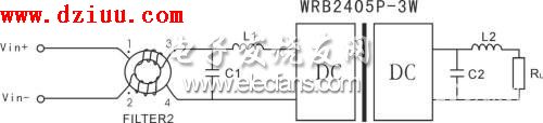 共模干擾,我們可以考慮在模塊的輸入端采用共模扼流圈FILTER2進行抑制(MORNSUN公司有此配套產品),如圖2 。   <<版權聲明:本文由容源電子網(www_dziuu_com)整理提供,部分內容來源于網絡,如有侵犯到你的權利請與我們聯系更正。》