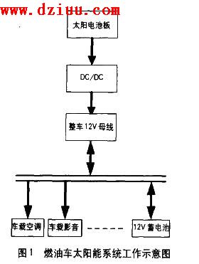 的部件主要是一個太陽電池板與一個DC/DC變換器。燃油車太陽能系統工作示意圖如圖1