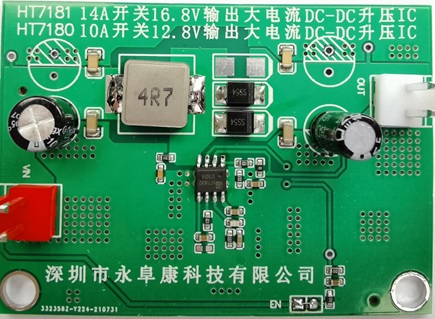 針對升壓值13V以下的DC-DC升壓應用需求,推廣一款集成10A開關管的12.8V輸出、大電流非同步DC-DC升壓IC:HT7180。HT7180采用獨到的電路研發技術以及先進的半導體工藝制程,基于SOP8封裝,工作效率高達90%以上,無需外加散熱器,3.7V輸入升壓到12V,可穩定輸出2A電流。