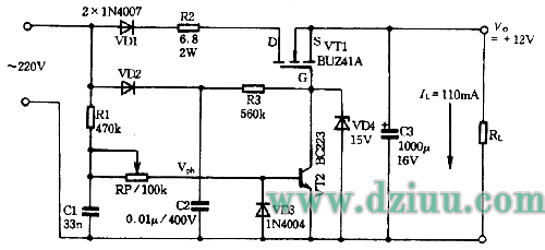 MOSFET(VT1)的柵極和開關晶體管VT2的集電極提供直流工作電壓。R1、RP與電容C1組成RC移相網絡。VD3是為電容C1對地充、放電而設置的。功率開關MOSFET的導通與關斷,受小信號晶體管VT2的控制。在交流電壓VAc的正半周,通過R1、RP使VT2導通。在VT2導通期間,VT1關斷。反之,在VT2截止時,VT1飽和導通。二極管VD1的作用是確保T1只在Vac的正半周的初始階段導通,形成針狀脈沖電流對大容量濾波電容C3充電。RC移相網絡產生一個移相電壓Vph,而且該電壓以輸入交流電壓Vac跨零交叉點為起點、移相電壓Vph只要達到VD的門限電壓,VT2則開啟導通,從而使VT1截止,于是對電容C3的充電終止。VT2關斷于工頻市電過零交叉點之后。由于VT1的漏極串接一只整流二極管VD1,故在Vac負半周不可能對C3充電。盡管在VT1導通時產生的針狀脈沖電流寬度很窄,也就是說對C3的充電時間很短,但由于C3的容量非常之大,放電時間常數也就很大,C3上的電壓因放電剛開始下降或下降不多的情況下,VT1再次導通,又開始對C3充電。因此,在C3兩端可產生比較平滑的直流輸出電壓VO。