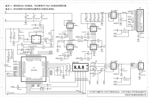 深圳市永阜康科技有限公司現(xiàn)在順勢(shì)推廣一顆支持PD3.1/QC3.0等主流快充協(xié)議、3-8節(jié)升降壓型140W鋰電充放電管理SOC-M12269。 該芯片是一款面向3-8串電芯大功率移動(dòng)電源應(yīng)用的專用SOC,集成了同步升降壓電壓變換器、電池充放電管理模塊、顯示模塊、電量計(jì)算模塊,提供最大140W輸入/輸出功率,支持 PD3.1、QC3.0、AFC、FCP、 SCP、BC1.2 DCP 等主流快充協(xié)議,并提供過壓/欠壓、過充/過放、過溫等完備的保護(hù)功能。封裝形式采用QFN-48(6.0×6.0mm,0.5mm pitch)。配合簡(jiǎn)單的外圍電路,即可組成大功率單路多口(C+A+A)移動(dòng)電源管理方案。