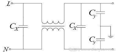 電源濾波器安裝在電源線與電子設備之間,用于抑制電源線引出的傳導干擾,又可以降低從電網引入的傳導干擾,對提高設備的可靠性有重要的作用。開關電源產生的電磁干擾以傳導干擾為主,而傳導干擾又分差模騷擾和共模干擾兩種。構成開關電源EMI濾波器的基本網絡如圖1所示。該濾波器由共模扼流圈L、差模電容Cx和共模電容Cy組成。共模扼流圈L由兩個繞在同一個高磁導率磁芯上的繞組構成,其結構使差模電流產生的磁通相互抵消。這種結構以較小體積獲得較大的電感值,并且不用擔心由于工作電流導致飽和。每個繞組與電容Cy分別組成L-E和N-E兩對獨立端口的低通濾波器,形成共模濾波網絡,用來抑制電源線上存在的共模干擾。至于共模扼流圈L、差模電容Cx和共模電容Cy的取值大小,應盡量做到濾波器的諧振頻率低于開關電源的工作頻率,這樣可以實現對整個頻段的濾波。