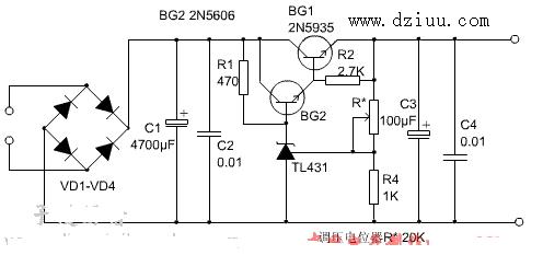 圖中電阻R4,穩壓集成電路TL431和可調電位器R*組成一個連續可調的恒壓源,為BG2基極提供基準電壓,穩壓集成電路TL431的穩壓值連續可調, 穩壓值決定了穩壓電源的最大輸出電壓,