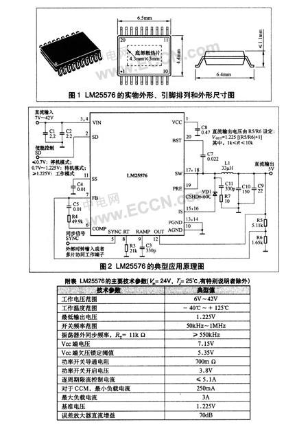 今年 NSC( 美國國家半導體公司 ) 先后推出了 6 款 SIMPLE SWITCHER 系列電壓變換器, LM25576 是其中的最新成員,它采用模擬電流控制模式 (ECM) ,降壓式電路結構,內部集成了 170m Ω的 N 溝道 MOSFET 功率開關,適應 6V ~ 42V 的直流輸入電壓,開關頻率由外部電阻在 50kHz-1000kHz