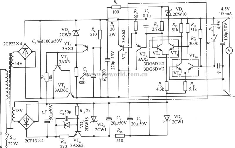 電路 后,得到4.5V 100mA的輸出電壓。電路元器件的參數在電路中,本電路最大的特點