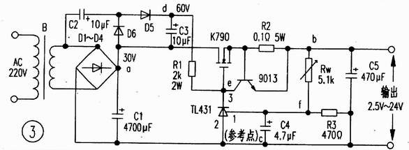 管(可直接并聯(lián)使用)以及C5是輸出濾波器電路等。穩(wěn)壓過程是:當(dāng)輸出電壓下降,F(xiàn)點(diǎn)肯定會下降,TL431放大后E點(diǎn)電壓就會上升,K790