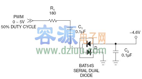 ,用一只BAT54S雙串聯(lián)肖特基二極管、兩只電容以及一只限流電阻構成的PWM電壓轉(zhuǎn)換器就可以提供負電壓(圖1)。 <<版權聲明:本文由容源電子網(wǎng)(www_dziuu_com)整理提供,部分內(nèi)容來源于網(wǎng)絡,如有侵犯到你的權利請與我們聯(lián)系更正。》