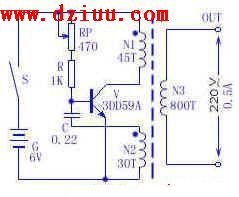 V選用3DD59A,R用1/4W的普通電阻,C選用0.22μF/50V,變壓器需自制,N1、N2繞組用?0.9mm的漆包線,N3繞組用0.67mm的漆包線,繞組框架 1mm厚的硬紙板制作,磁芯最好用鐵氧體U型或環(huán)型,如沒有,就用普通E型或F型硅鋼片代替,直流電流G用6V蓄電池。   <<版權(quán)聲明:本文由容源電子網(wǎng)(www_dziuu_com)整理提供,部分內(nèi)容來源于網(wǎng)絡(luò),如有侵犯到你的權(quán)利請(qǐng)與我們聯(lián)系更正。》