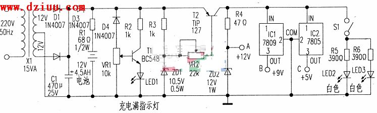 “B”和“C”端分別經穩壓芯片IC1和IC2提供9V和5V。LED2和LED3是兩只超亮白色LED.用于應急照明,R5、R6分別為限流電阻。    <<版權聲明:本文由容源電子網(www_dziuu_com)整理提供,部分內容來源于網絡,如有侵犯到你的權利請與我們聯系更正。》