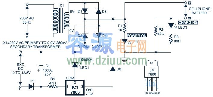 被應用到充滿活力的充電器,在電阻R4后,極性保護二極管D5,限制了輸入電流到安全值。3端子正電壓穩壓器LM7806(IC1)提供固定的7.8V直流電壓輸出, LED1的共同端(2腳)和地面鐵路IC1的輸出電壓上升到7.8V直流