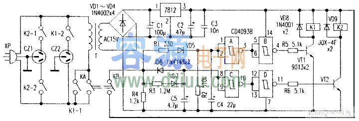 閉合電源開(kāi)關(guān)KA,AC220V市電由電源插頭XP引入,經(jīng)電源變壓器T降至15V,由VD1-VD4整流、C1濾波,7812穩(wěn)壓得到穩(wěn)定的12V直流電壓,為控制電路供電。KA和KB是雙聯(lián)開(kāi)關(guān),KA接通電源時(shí),KB也同步閉合,充放電電路獲12V工作電源。一路經(jīng)R1(330Ω)、VD5為C4快速充電,另一路經(jīng)R3{1.2MΩ)、VD7為C5慢速充電。   <<容源電子網(wǎng)論壇正式上線,為朋友們建立一個(gè)友好互動(dòng)交流平臺(tái),歡迎大家去論壇和朋友們一起分享、學(xué)習(xí)電子技術(shù)。對(duì)本文有什么疑問(wèn)請(qǐng)直接到論壇相應(yīng)欄目發(fā)貼求助。